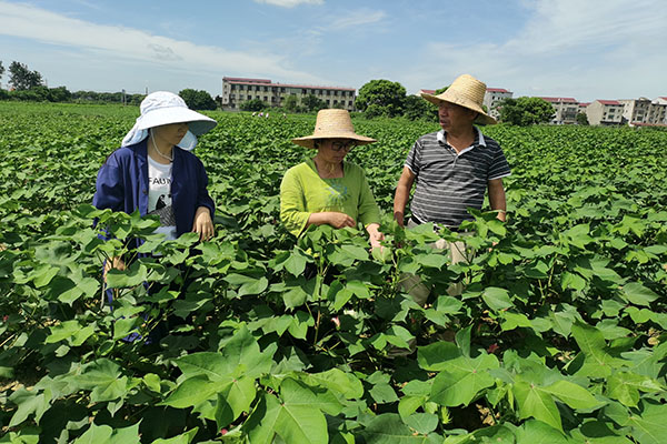 7月17日,省棉花轻简化栽培岗位专家孙桂琴带领团队和赣中试验站站长一同到高安市原种场和高安市黄敏家庭农场示范基地进行棉花中期生长情况调研和现场技术指导,由于近期时间雨水偏少,部分棉花有些长势过旺并需要化控,棉花下部叶片有点变黄要适当灌溉缓解当前旱情,省棉花轻简化栽培岗位专家孙桂琴亲自到示范基地带来缩节胺农药并指导种植大户如何化控,,化控采用二次稀释法,目前棉花长势还好,有少量的烟粉虱和棉叶蝉,棉花化控同时并结合防治病虫害加强田间管理等方面进行防控。目前棉花化控技术是棉花种植过程种植很关键的一个环节,第一是提高棉花产量的重要措施。第二能提高抗旱性、提高耐涝性、提高抗早衰能力、提高产量、提高品质、减少蕾铃脱落、减少虫害发生、减少烂铃。第三化控要遵循一早二少三勤的原则。下一步要扩大示范基地种植规模,适应现代作物的农业化生产。